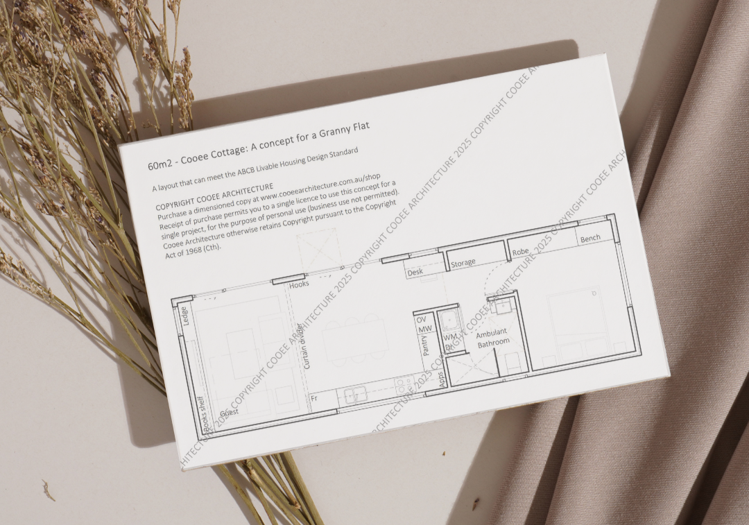 The Cooee 60m² Granny Flat concept, is a secondary residence layout designed to comply with the new accessibility requirements listed above. Purchase the dimensioned plan and a license to use it, here.